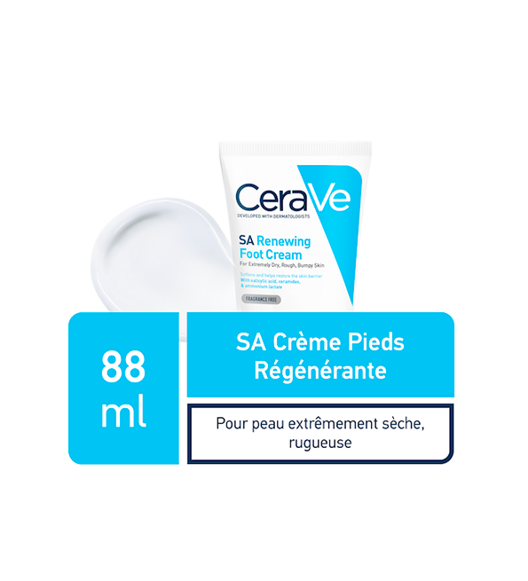 Développée avec des dermatologues, SA crème pieds régénérante Cerave hydrate efficacement et aide à restaurer la barrière protectrice de la peau des pieds. Sa texture non grasse enrichie aux 3 céramides essentiels, acide salicylique et lactate d’ammonium exfolie et hydrate la peau sèche et rugueuse des pieds pour adoucir et améliorer la texture de la peau.