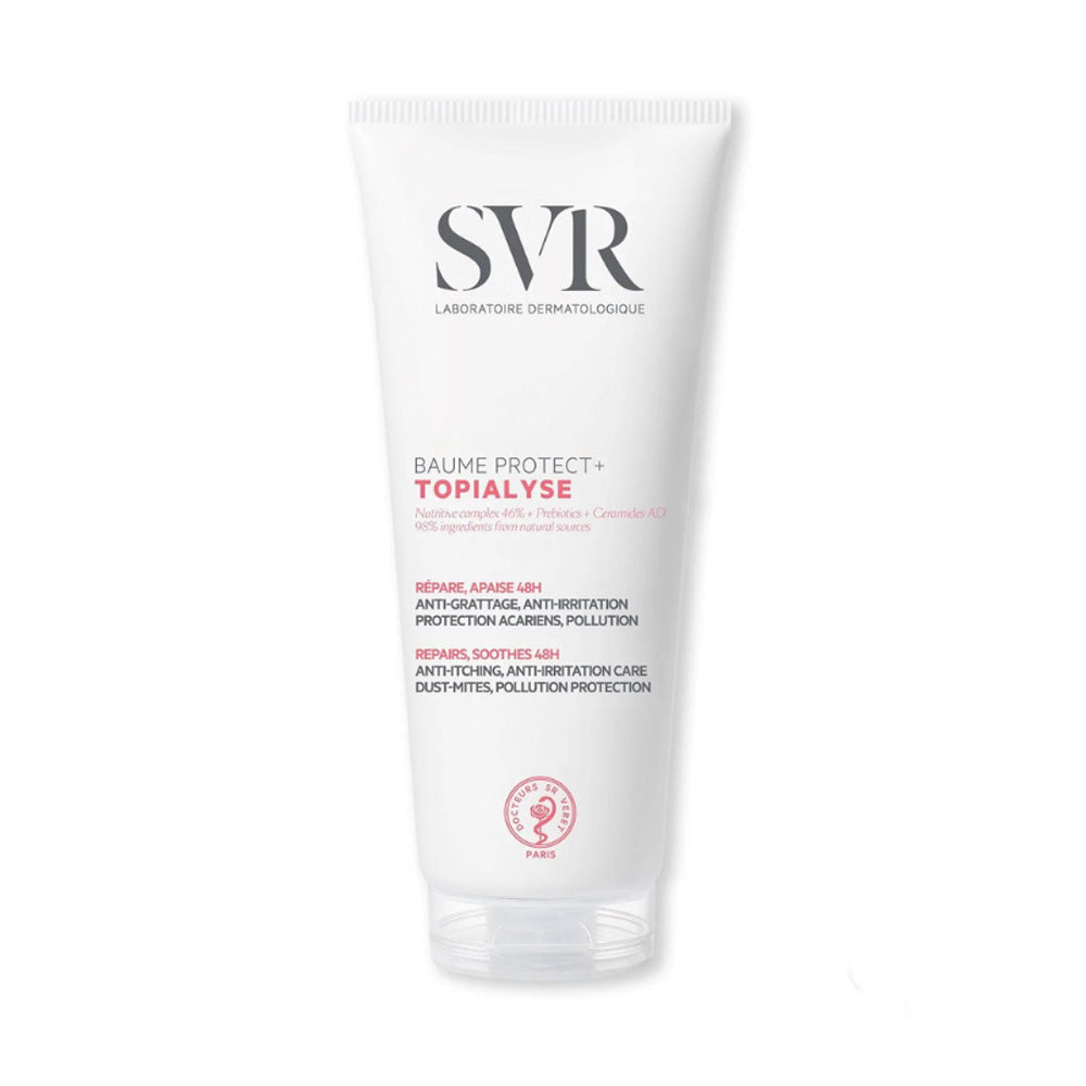 يحمي SVR TOPIALYSE PROTECT+ BALM جميع أنواع البشرة الأتوبية، المتهيجة بسبب الاعتداءات الخارجية (العث، التلوث، وما إلى ذلك)، ولا يسبب اللسع. يعمل على إصلاح وتلطيف التهيج مع الاستخدام المنتظم.