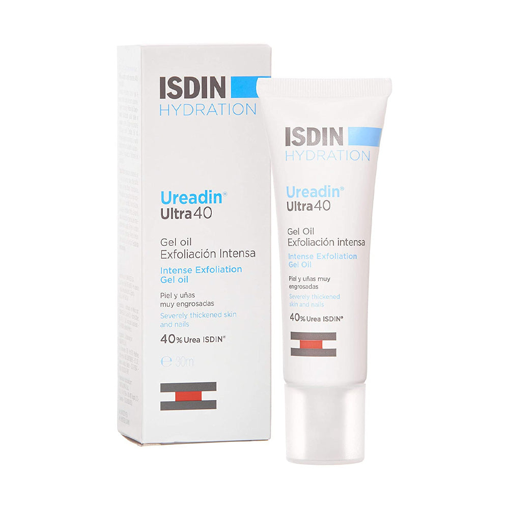 Ureadin ULTRA 40 Gel Oil Exfoliant ينعم ويقلل من سمك البشرة الجافة جدًا والسميكة بفضل نشاط التقشير المكثف للبشرة Urea Isdin. Ureadin Rx Oil gel 40 مرطب يحتوي على اليوريا، وهو فعال جدًا في المناطق التي يحدث فيها جفاف في الجلد. تعمل اليوريا على ترطيبها وتساعد على تقليل سمكها