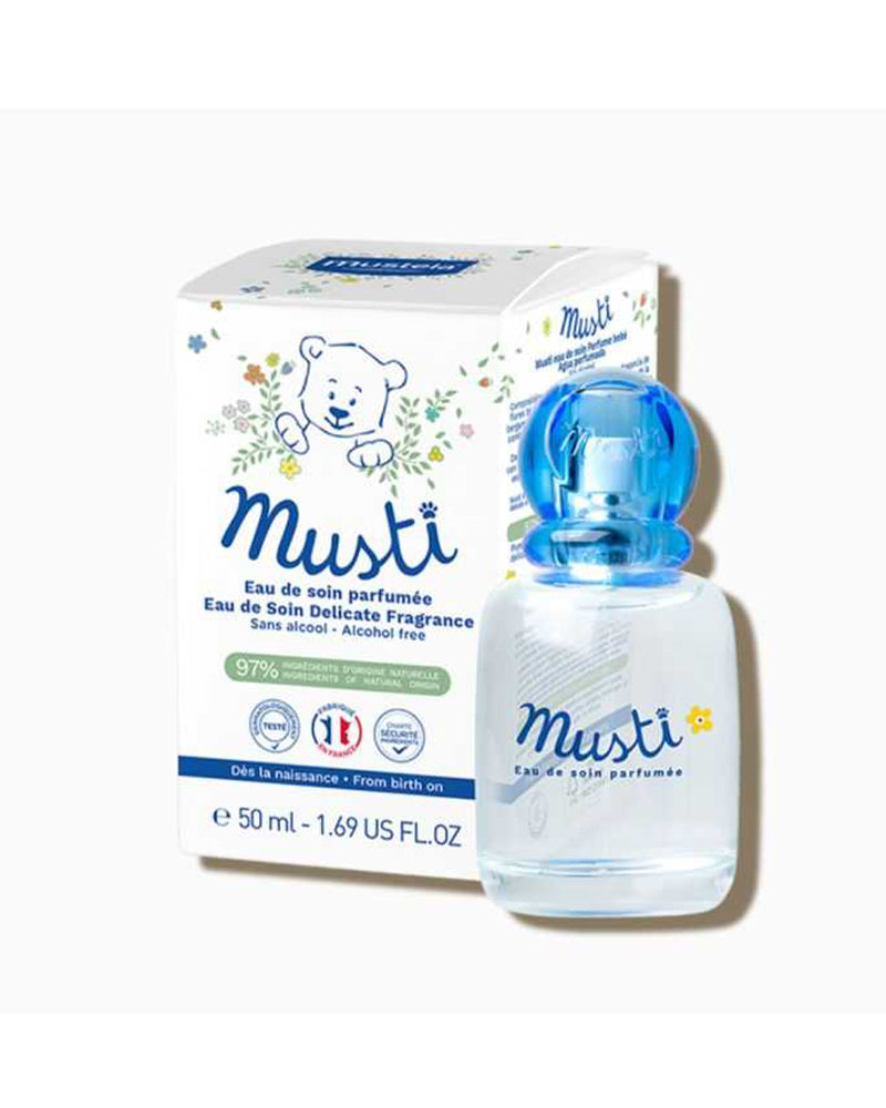 L'Eau de soin Musti parfume délicatement l'enfant et le bébé, apportant une touche de fraicheur et de tendresse, grâce à ses notes subtiles d’agrumes, de rose et de lilas. Elle est utilisable dès la naissance* en toute sécurité.