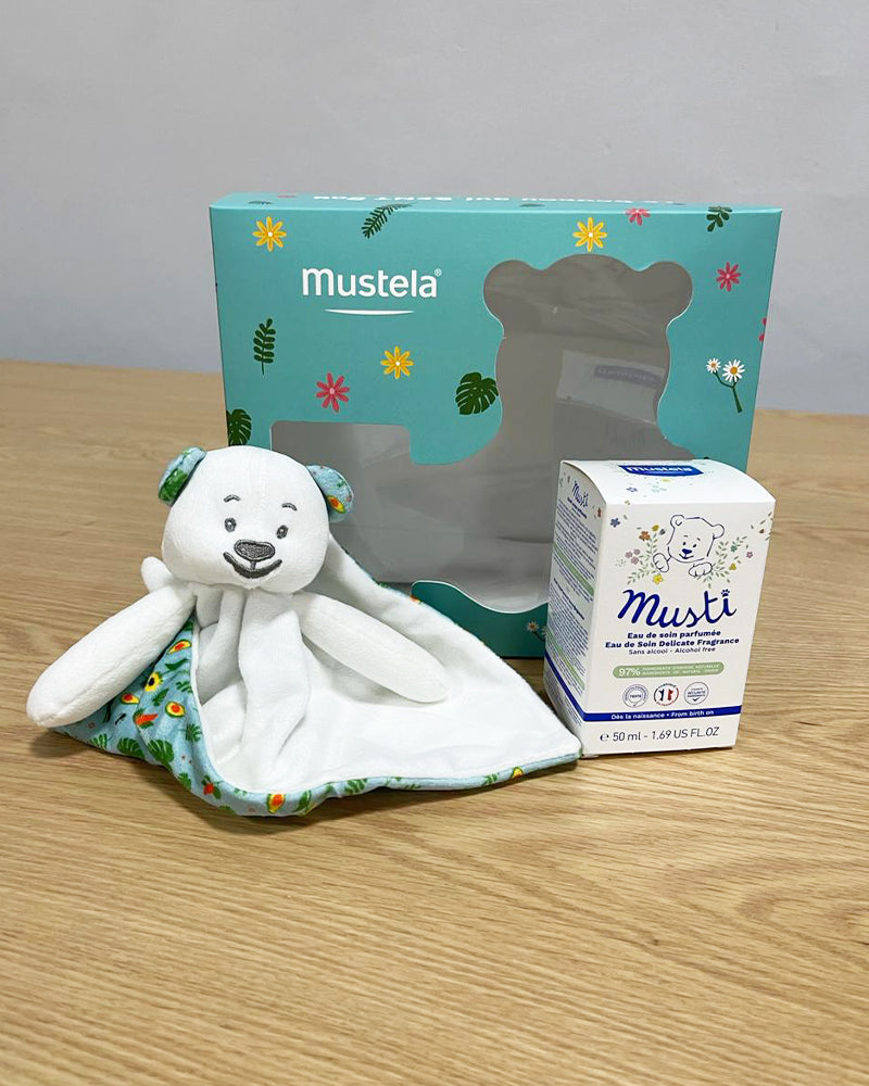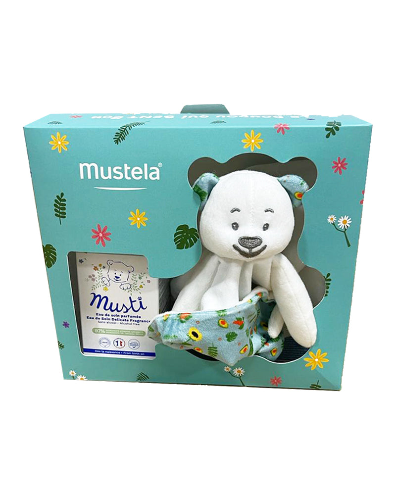 Cadeau de naissance idéal pour l'éveil sensoriel des bébés, notre nouveau coffret Musti allie l’odeur iconique de Mustela dans l'Eau de soin parfumée Musti, sans alcool, fabriquée en France et utilisable dès la naissance*, à la douceur d'une Peluche ours colorée en matière 100% recyclée, le tout dans un emballage plus responsable.