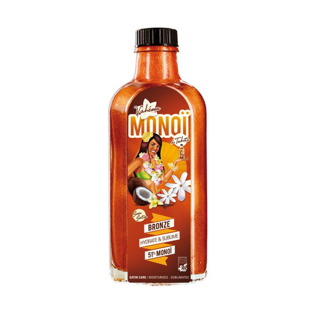 Un soin satiné bronzant qui Hydrate et Sublime avec 51% Monoï, riche en Monoï de tahiti, Ce Soin Satin Bronze hydrate et assouplit la peau et les cheveux.