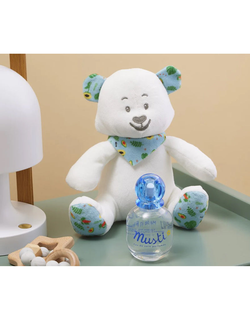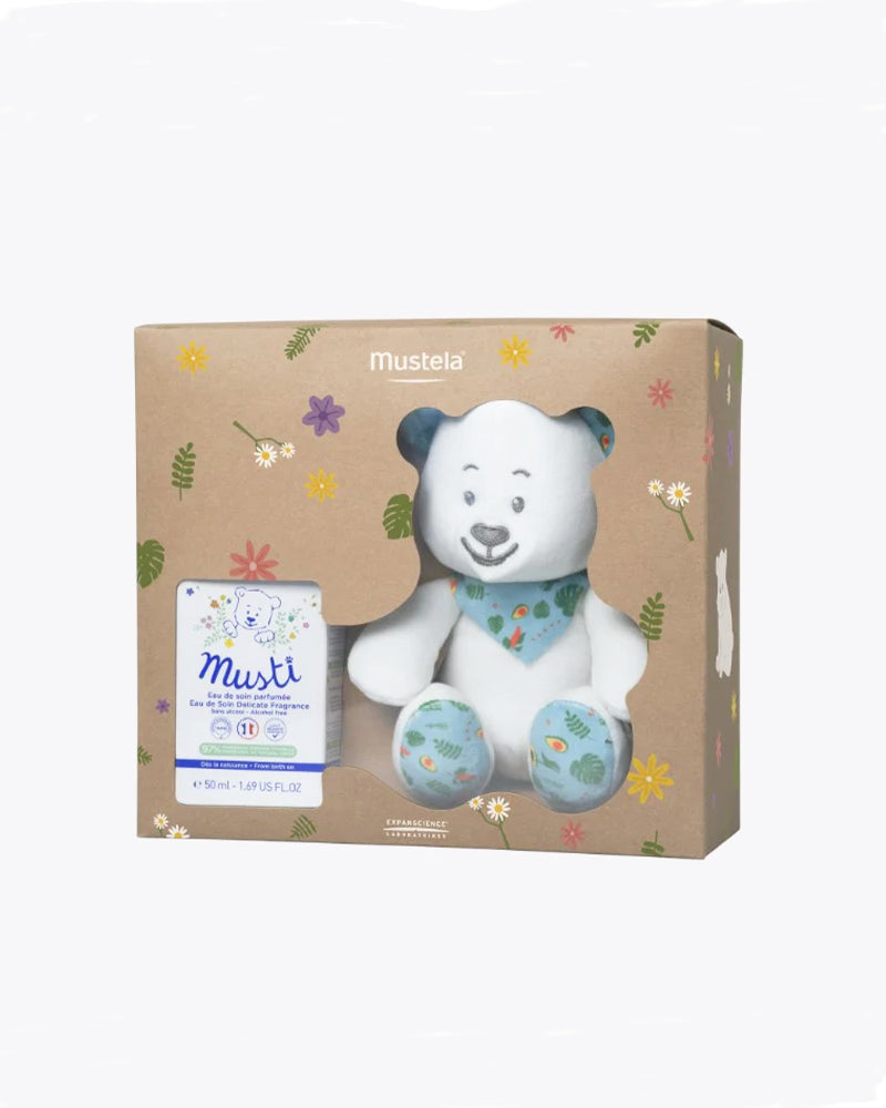 Cadeau de naissance idéal pour l'éveil sensoriel des bébés, notre nouveau coffret Musti allie l’odeur iconique de Mustela dans l'Eau de soin parfumée Musti, sans alcool, fabriquée en France et utilisable dès la naissance*, à la douceur d'une Peluche ours colorée en matière 100% recyclée, le tout dans un emballage plus responsable.
