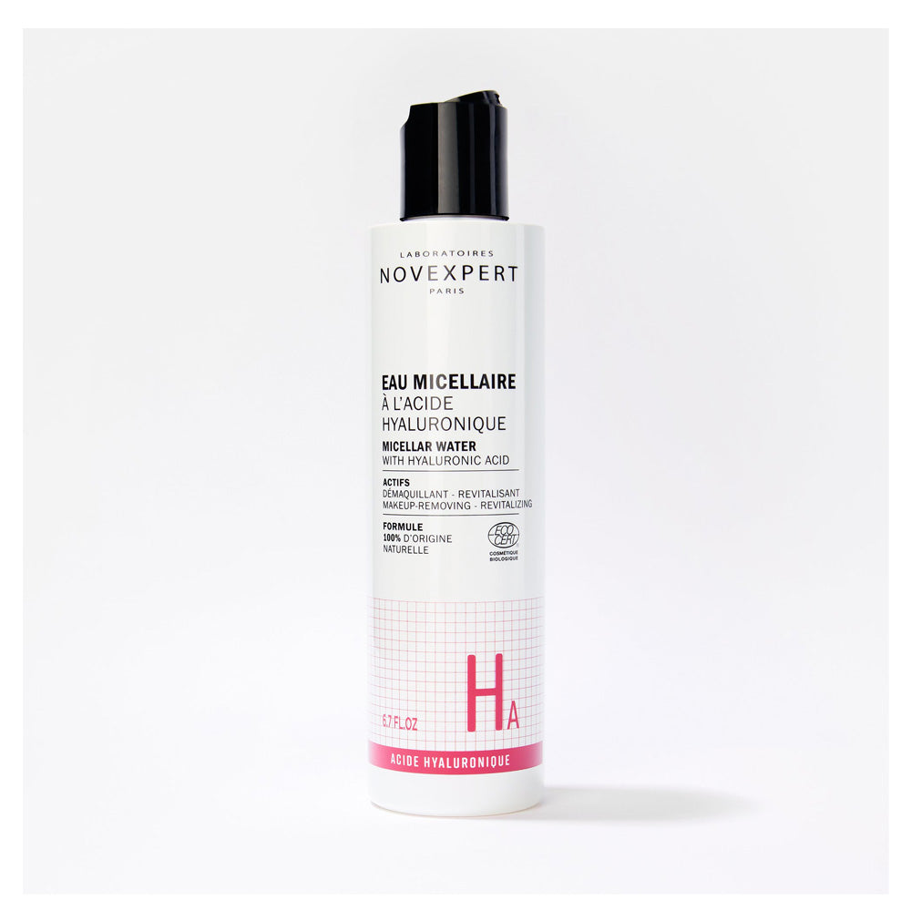 Réponses de l’Eau Micellaire Novexpert : côté pile, une formule 100% d’origine naturelle et hypoallergénique, côté face, une formule gorgée d’acide hyaluronique.