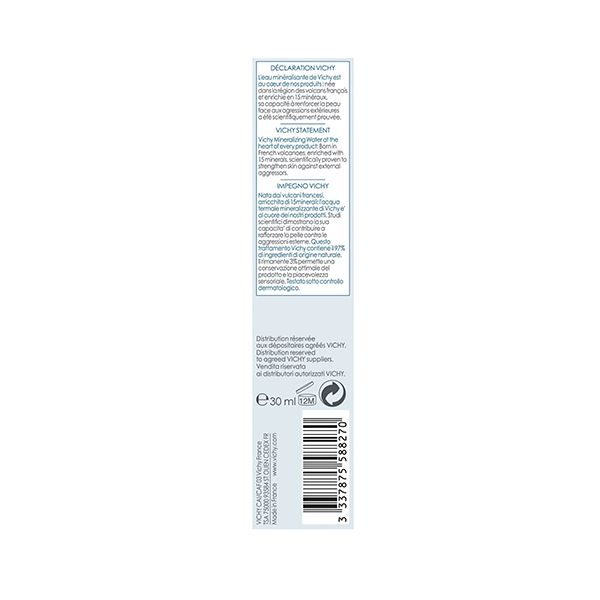 • Ingrédients Clés : Eau Thermale de Vichy pour apaiser | Acide Hyaluronique pour hydrater et lisser | Mannose Végétal pour réduire les imperfections.