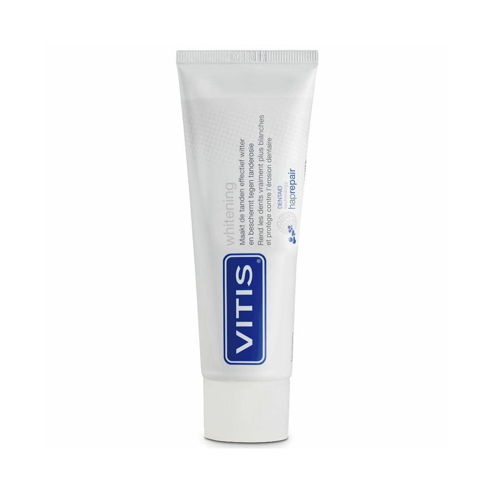 20Dh pour les Commande De 301 a 400DhVITIS Whitening Dentifrice restaure la blancheur fraiche naturelle des dents efficacement et rapidement. Il ne contient pas de peroxyde ou de composants abrasifs et convient donc particulièrement bien à un usage quotidien. La puissance de VITIS Whitening réside dans la DENTAID haprepair technologie® en 5 actions mise au point pour VITIS Whitening. Cette dernière fonctionne grâce à l’action de minuscules particules d’hydroxyapatite qui se fixent sur la surface dentaire. Leur taille leur permet d’être entièrement absorbées par l’émail et la dentine des dents. Ce faisant, elles comblent les irrégularités et les trous de la surface dentaire. Les dents sont plus lisses, plus brillantes et retrouvent leur blancheur.